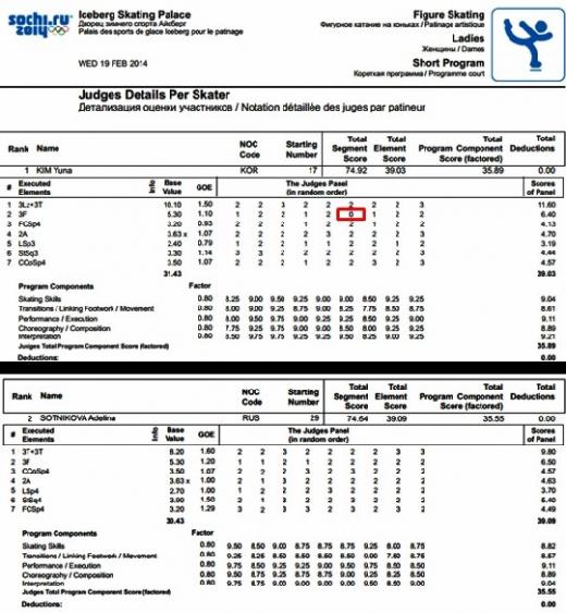 경기 후 국제빙상경기연맹(ISU)은 공식 홈페이지를 통해 김연아와 아델리나 소트니코바의 '프로토콜'(프로그램 상세 점수표)을 공개했다.