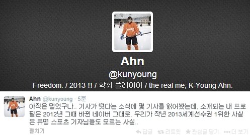 안근영은 4일 자신의 트위터에 "아직은 멀었구나. 기사가 떴다는 소식에 몇 기사를 읽어봤는데, 소개되는 내 프로필은 2012년 그때 바뀐 네이버 그대로"라면서 "우리가 지난해 2013 세계선수권 1위를 한 사실은 유명 스포츠 기자님들도 모르는 사실"이라고 적었다.