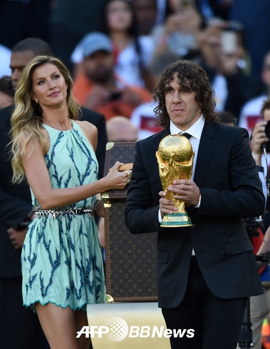 세계적인 톱 모델 지젤번천이 스페인 축구 대표팀의 주장인 카를레스 푸욜(바르셀로나)과 함께 경기 전 월드컵 우승 트로피 앞에서 포즈를 취하고 있다.