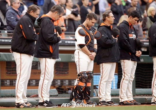 샌프란시스코 자이언츠 선수단 일동이 로빈 윌리엄스를 위한 묵념을 하고 있다./ AFPBBNews=뉴스1