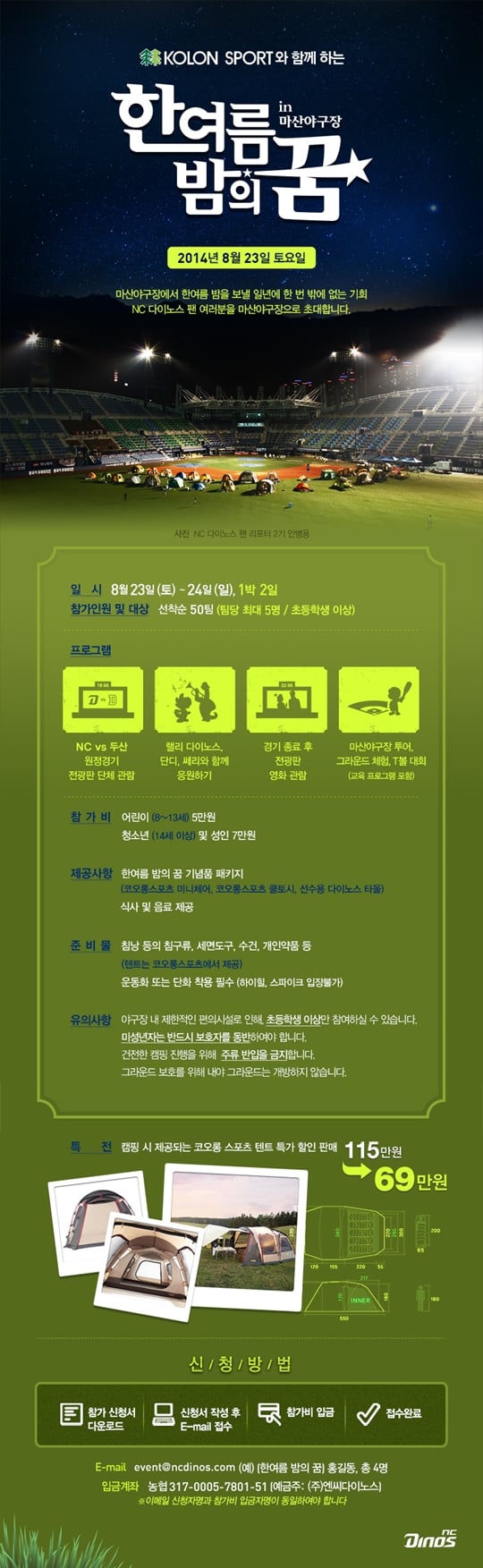 NC 다이노스가 오는 23일부터 24일까지 1박 2일 간 'KOLON SPORT와 함께하는 한여름밤의 꿈 in 마산야구장' 그라운드 캠핑 행사를 진행한다.