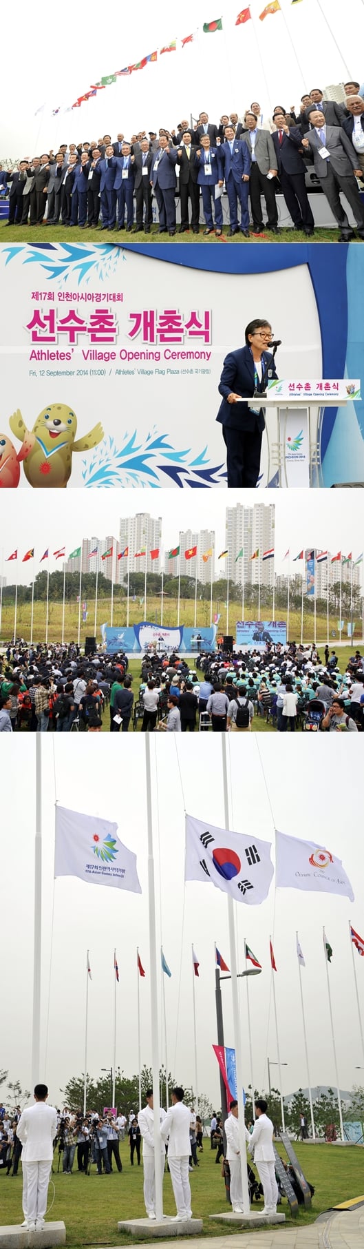 인천아시아경기대회 조직위원회는 12일 오전 11시 인천광역시 남동구 구월동에 위치한 구월아시아드 선수촌 국기광장에서 개촌식을 열었다.