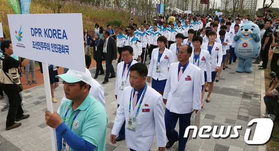 뉴스1에 따르면 북한 선수단은 아시안게임 개막을 하루 앞둔 18일 오전 10시 인천 남동구 구월아시아드선수촌 국기광장에서 공식 입촌식을 진행했다.