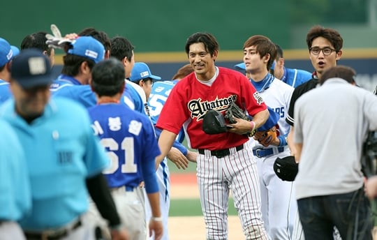 지난 8월 25일 서울 목동야구장에서 열린 한국프로야구은퇴선수협회와 연예인 올스타 간의 경기 후 인사를 나누는 모습. /사진=한스타 제공