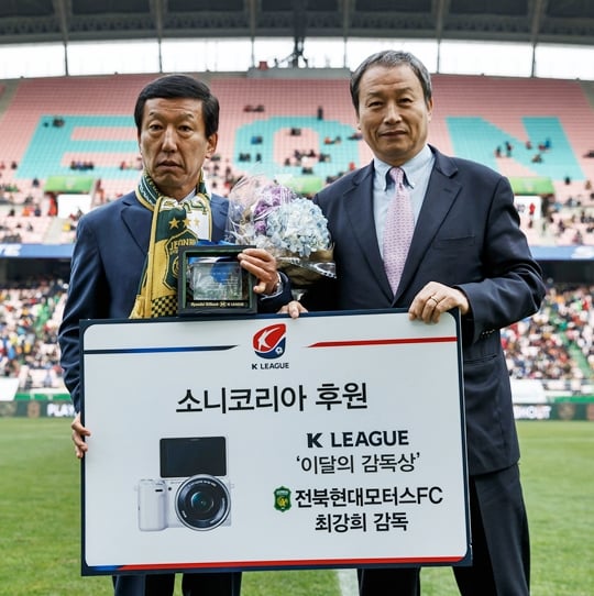 최강희 감독은 15일 전주월드컵경기장에서 열린 현대오일뱅크 K리그 클래식 36라운드 하프 타임에 전북 팬들의 환호 속에서 '소니코리아 이달의 감독상'을 수상했다. 최강희 감독에게는 트로피와 소니코리아 디지털카메라 ‘NEX-5T'가 부상으로 주어졌다.