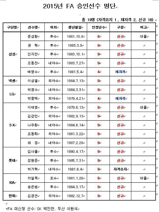 KBO는 19일 오전 2015년 FA 자격 선수로 공시된 21명 중 FA 권리 행사를 신청한 19명의 선수를 공시했다.
