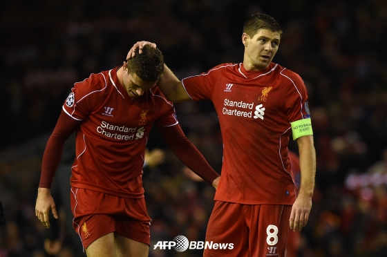 스티븐 제라드(오른쪽) 동점골을 넣었지만 추가골을 성공시키지 못한 리버풀이 결국 무승부를 기록했다./ AFPBBNews=뉴스1