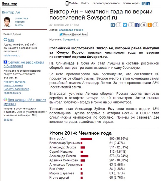 러시아 일간지 소베츠키 스포르트는 29일(이하 한국시간) "홈페이지 방문자가 선정한 올해의 챔피언에 빅토르 안이 선정됐다"라고 전했다.
