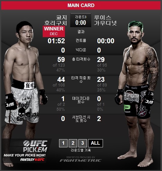 호리구치는 4일(이하 한국시간) 미국 네바다주 라스베이거스 MGM 그랜드가든 아레나에서 열린 'UFC 182' 플라이급 매치에서 가우디넛을 맞아 심판 전원일치 판정승을 거두고 승리를 기록했다.