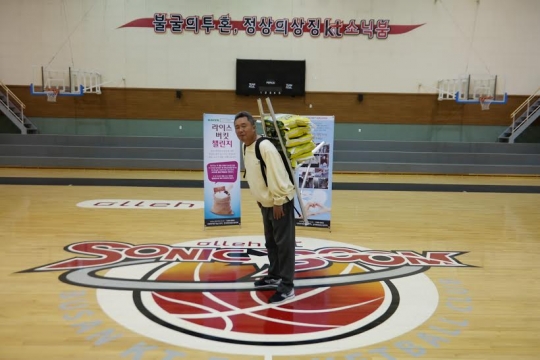 프로농구 부산 kt 소닉붐의 전창진 감독이 8일 수원 올레빅토리움에서 '라이스버킷 챌린지' 기부 캠페인에 동참했다.