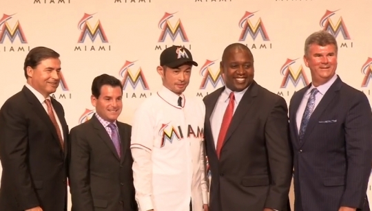일본이 배출한 ‘타격기계’ 스즈키 이치로가 29일 마이애미 말린스와 200만달러에 계약했다. 이날 일본 도쿄에서 거행된 이치로의 계약 발표에는 말린스의 데이빗 샘손 사장과 마이클 힐 경기담당 사장, 댄 제닝스 단장 등 5명의 구단 중역이 18시간에 걸쳐 비행기를 타고 태평양을 건너와 참석했다. 이처럼 팀 수뇌부가 일본까지 총 출동한 것은 이치로와의 계약이 단순한 팀의 백업 외야수 겸 대타요원과의 계약 이상의 의미가 있음을 보여준다.