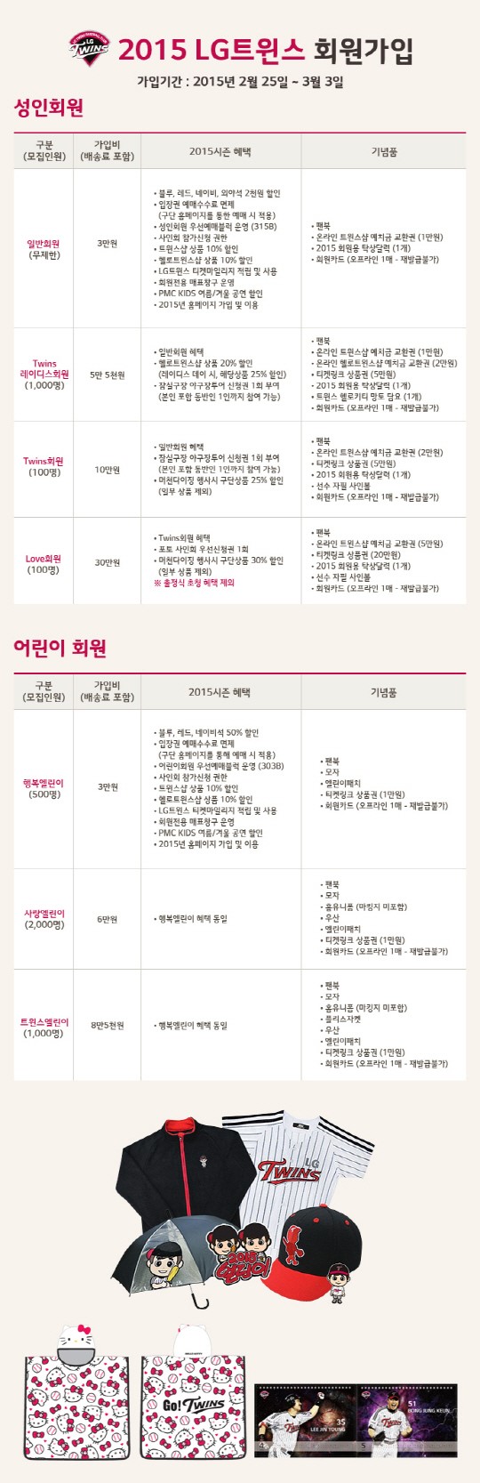 가입신청은 LG트윈스 홈페이지(www.lgtwins.com)에서 가능하며, 자세한 사항은 LG트윈스 콜센터(1544-4961, 4962)에서 확인할 수 있다.