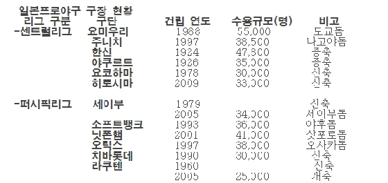 <일본의 구장 현황>일본도 구단 수입에 큰 비중을 차지하는 것은 입장료이다. 그런데 1930년 전후에 건립한 구장은 관중 수용규모가 1만석 내외여서 수입 증대에 한계가 있었다. 1950년 양 리그 제도가 시작된 후 1960년부터 본격적으로 구장 증축이 시작됐다. 신축이 아니라 3만~3만5,000석 규모로의 증축이 먼저였다.