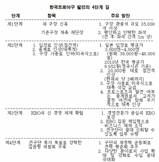 한국프로야구가 무한하게 발전할 수 있는 길을 4단계로 정리해 표로 만들었다. 그 시작은 무조건 새 구장의 건설과 활용할 수 있는 기존 구장의 재 단장이다. 굳이 설명도 필요 없는 부분이다.