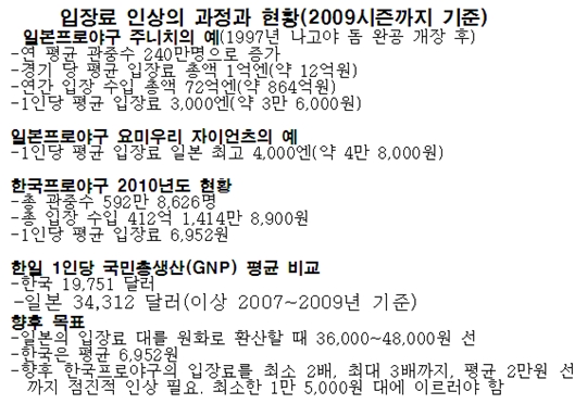 입장료에 있어 일본의 경우 주니치가 3,000엔(36,000원), 요미우리 자이언츠가 4,000엔(48,000원) 정도이다. 원화로 환산하면 평균 42,000원인데 2010년 한국 프로야구장 입장료 평균가(객단가)는 6,952원에 불과했다. 양국의 1인당 국민 소득을 비교해도 턱없이 싸다. 3배 안팎까지 인상이 필요하다. 2011년에는 681만 관중 시대 입장 총수입 552억6,200만원(객단가 8,115원)