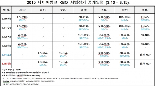 KBO가 2015 타이어뱅크 KBO 10일부터 15일까지 열리는 시범경기 중계일정을 발표했다.