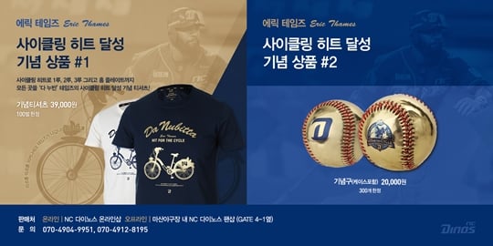 사이클링 히트 기념구는 테임즈가 즐겨 사용하는 컬러인 황금색을 이용했다. 300개 한정 제작(케이스 포함)으로 가격은 2만원이다. 기념 상품은 창원 마산야구장 내 팬샵과 다이노스 온라인샵(http://me2.do/G1RDlnkT)에서 살 수 있다.