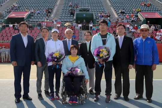 테크노화이버 휠체어 테니스단이 17일 서울 올림픽공원 테니스코트에서 서울오픈챌린저 남자단식 결승전 직후 주원홍 대한 장애인 테니스협회 회장(대한테니스협회 회장 겸임)과 테크노화이버 김재형 대표이사를 비롯한 관계자들이 모인 가운데 창단식을 진행했다.