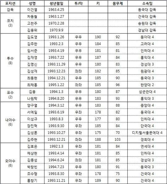 대한야구협회는 오는 7월 6일부터 11일까지 광주에서 개최되는 '2015 광주하계유니버시아드대회'에 참가할 국가대표팀 코칭스태프와 선수단 최종 엔트리(22명)를 확정했다.
