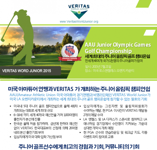 비영리단체 바리타스 월드 주니어(VERITAS World Junior 한국대표부, 이천희 대표이사)가 4일 미국 아마추어 경기연맹(AAU)과 공동 주최하는 '2015 AAU 주니어 올림픽게임 골프 챔피언십'에 출전할 한국 선수를 모집한다고 밝혔다.