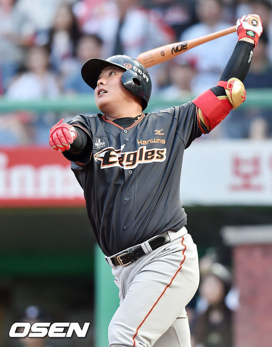계속된 2사 2,3루 기회. 김태균은 집중력을 잃지 않았다. 그리고 켈리의 6구째 151km짜리 속구를 통타, 좌중간 담장을 넘어가는 스리런 아치를 그렸다.