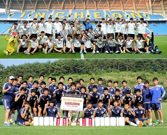 K리그 산하 U-18세 유소년클럽 최강자를 가리는 '2015 아디다스 K리그 주니어' 전기리그에서 우승을 차지한 인천 대건고와 울산 현대고(아래 사진) 선수단이 1일 오후 인천축구전용경기장에서 열린 K리그 클래식 인천-광주 경기를 앞두고 우승 시상식을 가졌다. /사진=인천 유나이티드(위) 및 울산 현대 제공