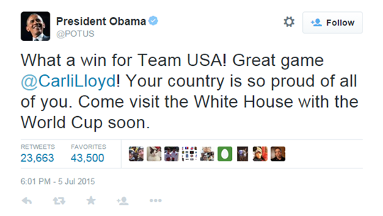 경기 후 오바마 대통령은 자신의 공식 트위터에 "미국의 엄청난 승리다. 당신들 모두 미국의 자랑이다"며 기뻐했다. 이어 "월드컵 우승 트로피를 들고 백악관으로 오라"고 덧붙였다. 오바마 대통령도 쉽게 흥분을 감추지 못하는 모습이다.
