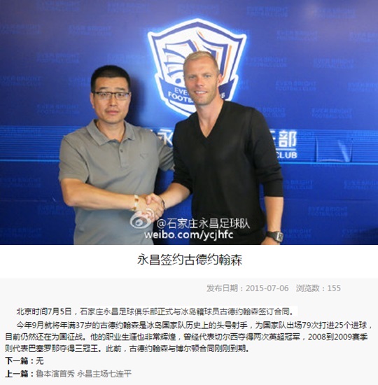 중국 스좌장 용창이 아이슬란드 대표 공격수 아이두르 구드욘센(37)을 영입했다.