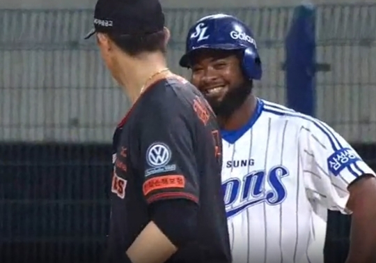 그런데 이후 나오지 말았어야 하는 장면이 연출됐다. 적시타를 맞은 에스밀 로저스가 안타를 치고 나간 나바로가 있는 1루 쪽을 흘깃 쳐다본 순간 나바로가 입을 크게 벌린 환한 웃음으로 응답한 것이다.