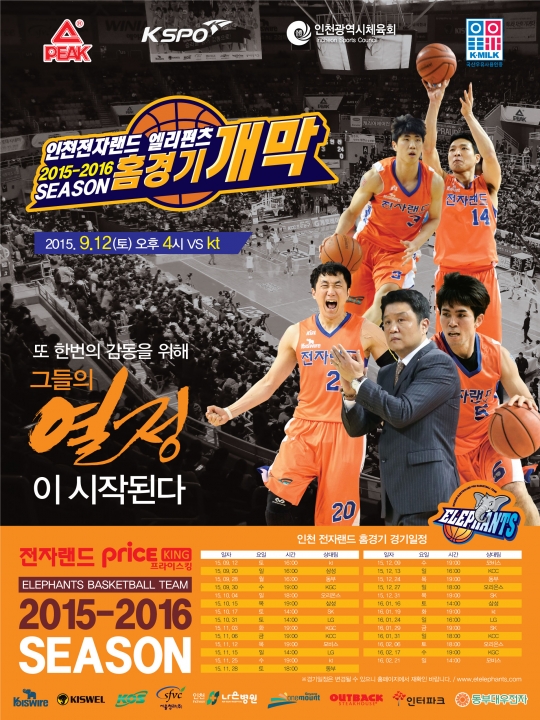 인천 전자랜드가 12일 오후 4시(개막식 오후 3시) 인천 삼산 월드 체육관에서 열리는 2015-16 KBL프로농구 정규리그 부산 kt와의 홈 개막전 입장권 예매를 1일 오후 2시에 오픈 한다.