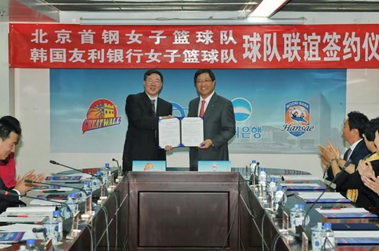 우리은행 소속 여자농구단 춘천 우리은행 한새농구단이 지난 20일 중국 북경 수도철강센터에서 중국 수도철강 여자농구단과 자매결연을 맺었다.