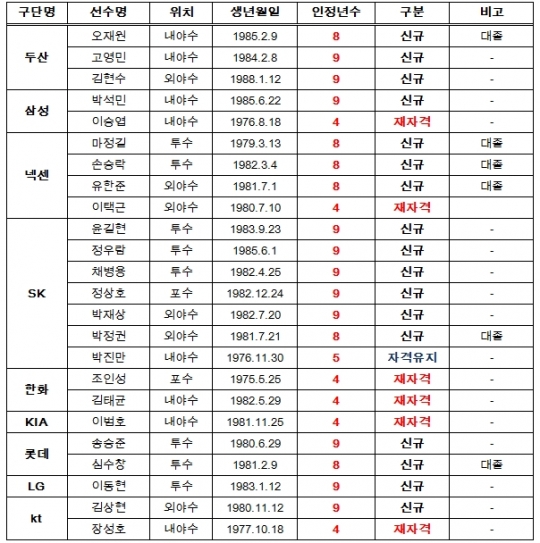이 중 첫 FA 자격을 얻은 선수는 17명, 재자격 선수가 6명이며 이미 FA 자격을 취득했지만 FA 승인 신청을 하지 않고 자격을 유지한 선수는 1명이다. 신규 FA 선수 중 오재원, 마정길, 손승락, 유한준, 박정권, 심수창 등 6명은 4년제 대학 졸업 선수로 8시즌 만에 FA 권리를 행사하게 됐다.