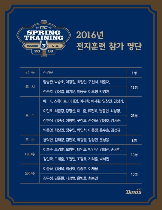 NC 다이노스는 이번 전지훈련을 '서부행진(March West)'이라 이름 지었다. 미국 서부 애리조나에서 캘리포니아로 이어지는 여정을 통해 새로운 길을 개척하고 2016시즌 당당하게 나아가겠다는 의미를 담았다.