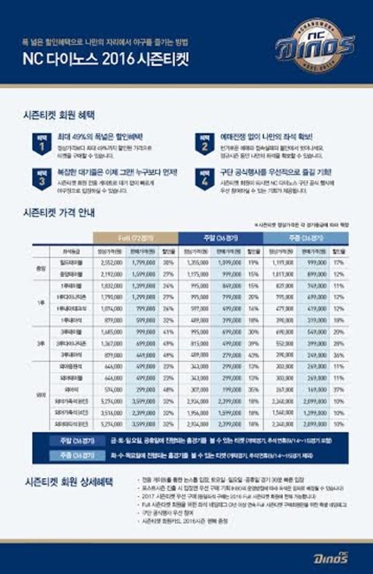 2016년 시즌티켓은 구단 홈페이지(www.ncdinos.com)와 티켓링크(www.ticketlink.co.kr)에서 살 수 있으며, 자세한 내용은 NC다이노스 마케팅팀 (055-608-8265)으로 문의하면 된다.