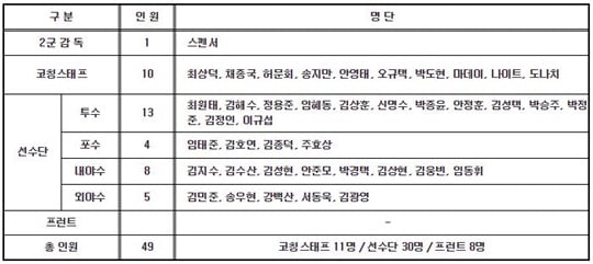 이번 퓨처스팀 대만 전지훈련 명단은 쉐인 스펜서 2군 감독을 포함한 선수단과 프런트 등 총 49명으로 구성되었으며, 17일 오후 1시 30분 BR(에바항공) 711편을 이용하여 인천공항을 통해 대만 가오슝으로 출국한다.