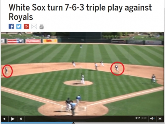 시카고 화이트삭스는 11일(이하 한국시간) 미국 애리조나에서 열린 캔자스시티 로열스와의 시범경기서 트리플플레이를 펼쳤다. 사실상 로열스의 본헤드 플레이로 거저 얻은 장면이긴 했다.
