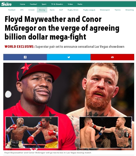 영국 대중 매체 더 선은 7일(이하 한국시간 "메이웨더와 맥그리거의 10억달러 매치가 성사 직전에 와 있다(Floyd Mayweather and Conor McGregor on the verge of agreeing billion dollar mega-fight)"고 독점 보도했다.