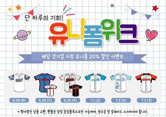 롯데 자이언츠가 28일부터 7월 3일까지 6일간 진행하는 유니폼위크를 맞아 유니폼 할인 이벤트를 진행한다.