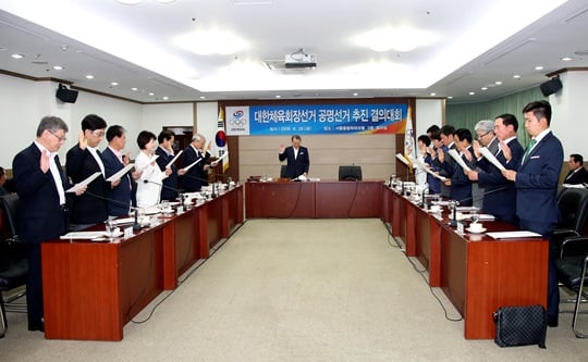 대한체육회가 26일 오전 올림픽파크텔 3층 회의실에서 제6차 이사회를 열고 10월 5일 실시되는 제40대 대한체육회장 선거 업무의 원활한 수행을 위해 선거운영위원회를 구성하고 공명선거 추진 결의대회를 가졌다.