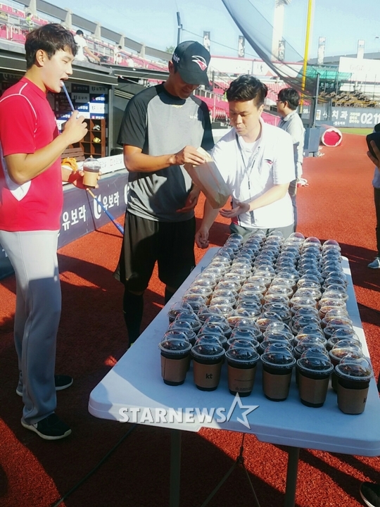 선수단 중 대표로는 고영표가 나섰다. 25일 경기 전 고영표와 SK 서진용은 승리 팀에 '선수단에 커피 100잔 쏘기'를 내걸었다. 하지만 가혹하게도 고영표가 25일 경기서 패전 투수가 됐다.