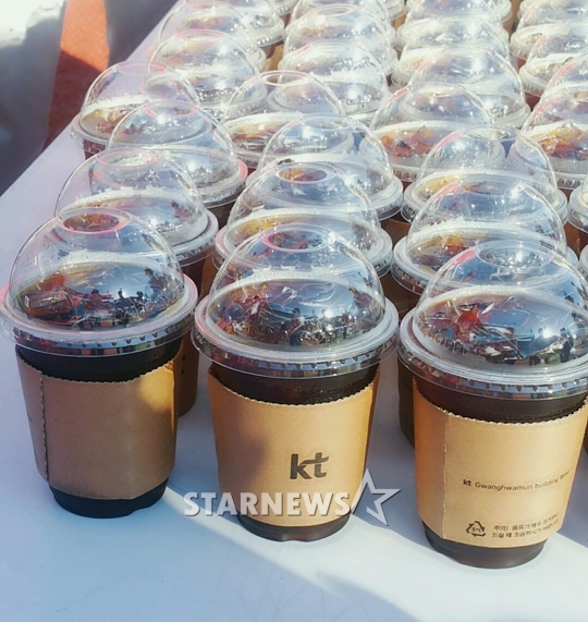 특히 커피 홀더에는 'kt' 마크가 눈에 띄었다. kt 관계자는 "하루 만에 kt 글씨가 박힌 홀더를 만들 수 없어 광화문 본사에서 가져왔다"고 귀띔했다.