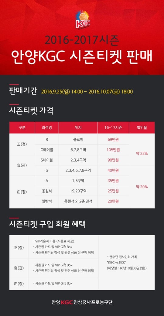안양KGC인삼공사 농구단이 오는 25일 14시부터 2016-2017 시즌권 판매를 시작한다.