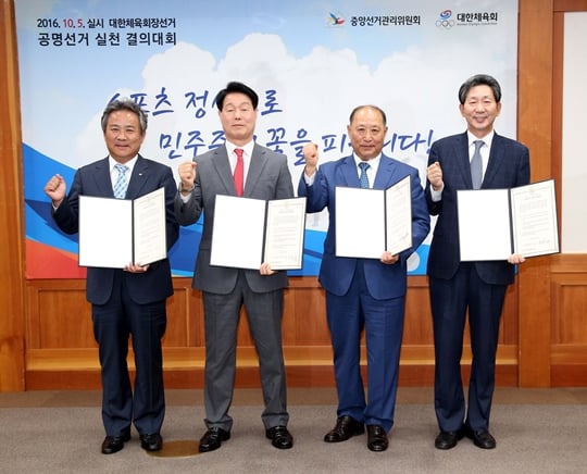 선거운동에 앞서 23일 오후 6시 중앙선거관리위원회 4층 회의실에서 개최된 ‘대한체육회장 선거 공명선거 실천 결의대회’에 장정수, 이기흥, 장호성, 전병관 후보자가 참석, 공명선거 실천 결의를 다짐하고 결의문을 채택했다.