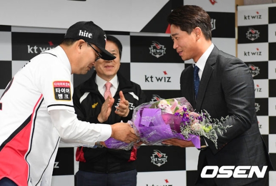 kt 위즈의 제 2대 감독으로 선임된 김진욱 감독(56)이 취임식을 갖고 새 사령탑으로서의 첫 발을 내디뎠다. 주장 박경수도 새로운 감독을 환영했다.