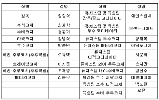 아울러 육성팀(3군) 내야 수비코치로 활약한 조재영 코치는 1군 작전,주루코치(추후확정)로, 전력 분석팀 김동우 팀장이 배터리코치로 이동해 선수들을 지도하게 될 예정이다.