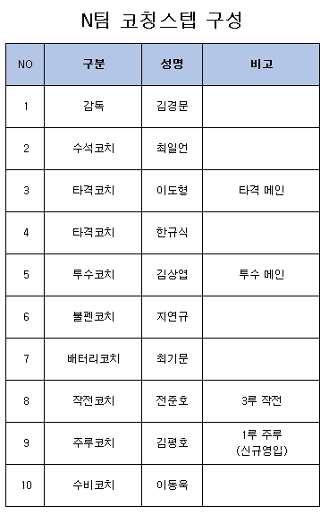또 투수 코치였던 최일언 코치가 수석코치로 임명됐다. 최 수석코치는 선수단과 코칭스태프 전체를 지원할 예정이다. 최일언 코치가 맡았던 기존 역할은 김상엽 코치가 수행한다.
