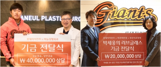 먼저 28일 오전 11시 하늘성형외과에서 김성호 원장과 신본기가 참석한 가운데 소외계층에 대한 의료지원 기금 전달식을 진행했다. 롯데 자이언츠와 하늘성형외과는 지난 6월 의료지원을 통한 사회공헌활동 협약을 맺은 바 있으며 초록우산어린이재단이 후원하는 아동들을 대상으로 구순열술, 상안검 및 눈썹 하거상술 등 약 4,000만원에 해당하는 수술을 지원한다.