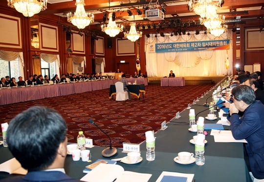 대한체육회(회장 이기흥)는 27일 오후 2시 30분 올림픽파크텔 1층 올림피아홀에서 2016년도 제2차 임시대의원총회를 개최하고 제40대 대한체육회 임원 선임을 이기흥 회장에게 위임키로 의결했다.