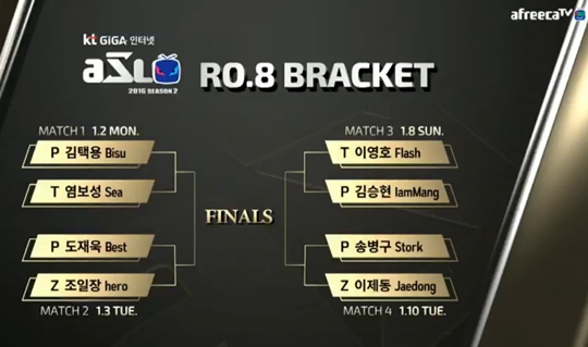 ASL 스타리그 8강 대진표가 완성됐다. 택뱅리쌍이 모두 8강에 오른 가운데, 같은 종족끼리 맞붙는 경기는 없다. 관심을 끄는 경기는 송병구와 이제동의 매치업이다.