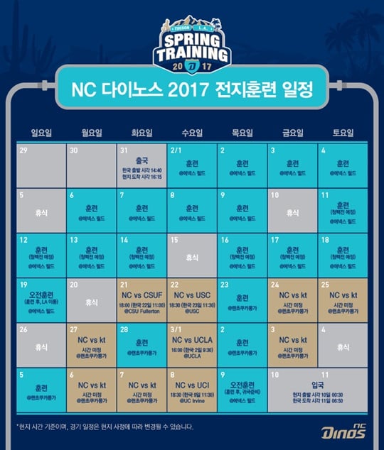 NC 퓨처스팀인 고양 다이노스 선수단도 올해는 대만이 아닌 애리조나 투산에서 전지훈련을 진행한다. 2월 19일부터 3월 14일까지 머물며 텍사스 레인저스 산하 마이너팀, 지역 대학 명문팀인 애리조나대학 야구팀과 경기를 펼칠 예정이다.